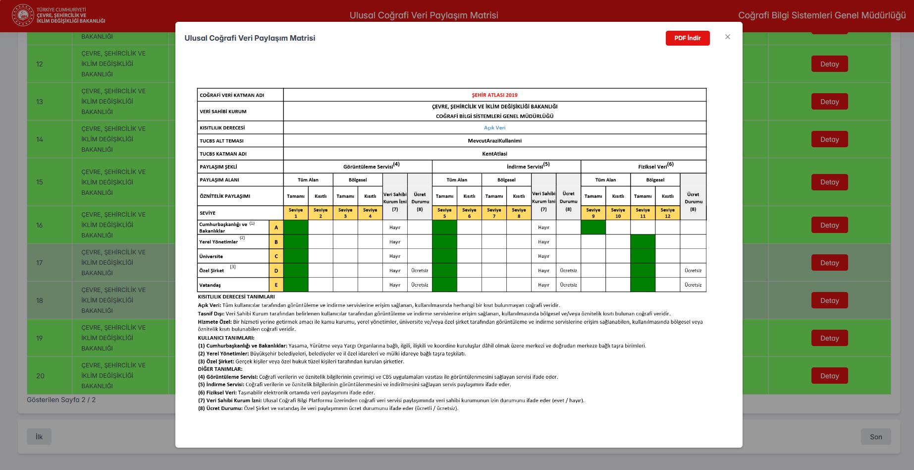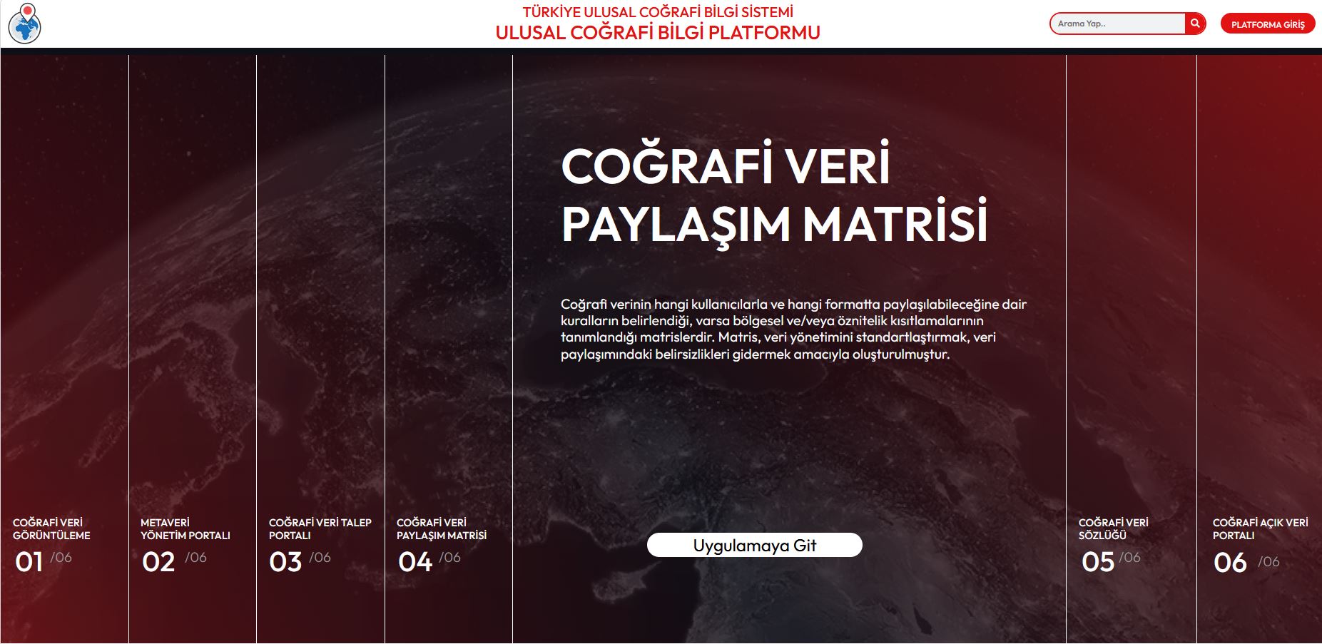 Ulusal Coğrafi Veri Paylaşım Matrisi kapsamında yapılan güncellemeyle birlikte toplam coğrafi veri katman sayısı 730’a yükselirken, 126 yeni veri tanımlandı, 26 veri ise iptal edildi. Ulusal Coğrafi Veri Paylaşım Matrisinde yer alan 730 coğrafi veri katmanın 177’si açık veri, 369’u tasnif dışı, 184’ü ise hizmete özel veri olarak sınıflandırıldı.
